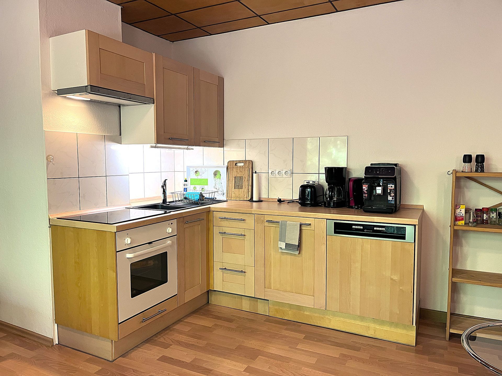 Küche: Spülmaschine, Kühlschrank mit Gefrierfach, Herd, Backofen, Toaster, Geschirr, Besteck, Töpfe, Pfannen, Geschirrhandtuch, Öl, Pfeffer und Salz